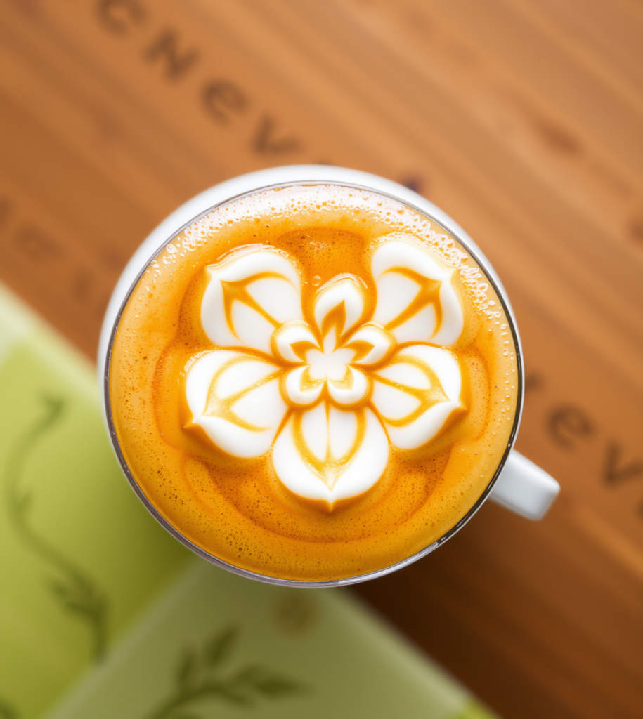 This vibrant caramel blossom adds an extra dimension of color and flavor. The precise petals, likely achieved with a combination of pouring and etching, create a stunning floral design that’s almost too pretty to drink.