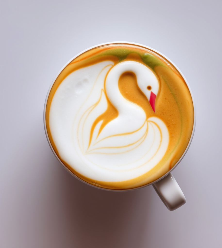 The swan is one of the most celebrated and difficult designs in the traditional free-pour latte art repertoire. This rendition is exceptionally beautiful, with its neck bent in an elegant curve, and subtle touches of color adding to its charm.