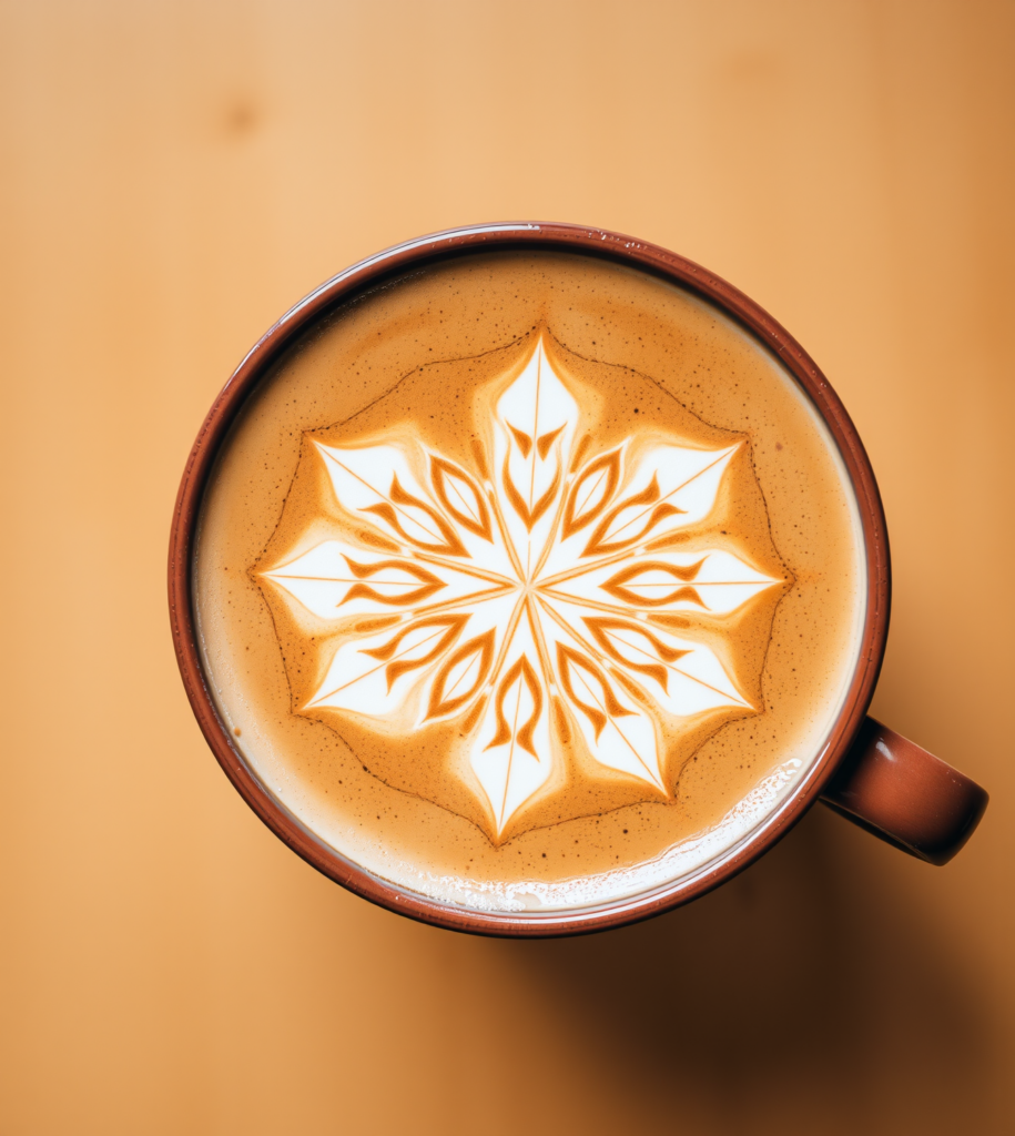 A complex, snowflake-like pattern demonstrating advanced etching and contrast.This intricate design showcases the power of etching and precision. The snowflake-like mandala, with its sharp, detailed points, elevates the barista’s craft to a fine art form, perfect for contemplation.