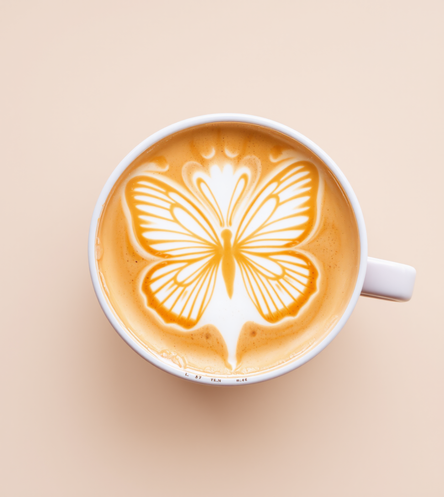 A symbol of transformation, the butterfly is beautifully captured here in creamy foam. Its elegant, symmetrical wings are sketched with impressive precision, showcasing exceptional control and artistic vision.