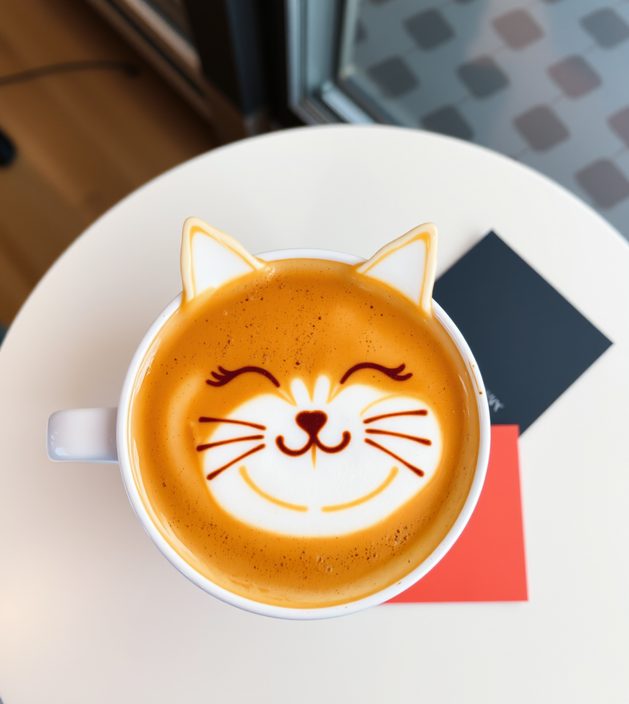 This smiling cat, complete with distinct foam ears, is an example of etched foam art that adds a playful, three-dimensional element. The heart-shaped nose and cheerful eyes make it utterly irresistible.