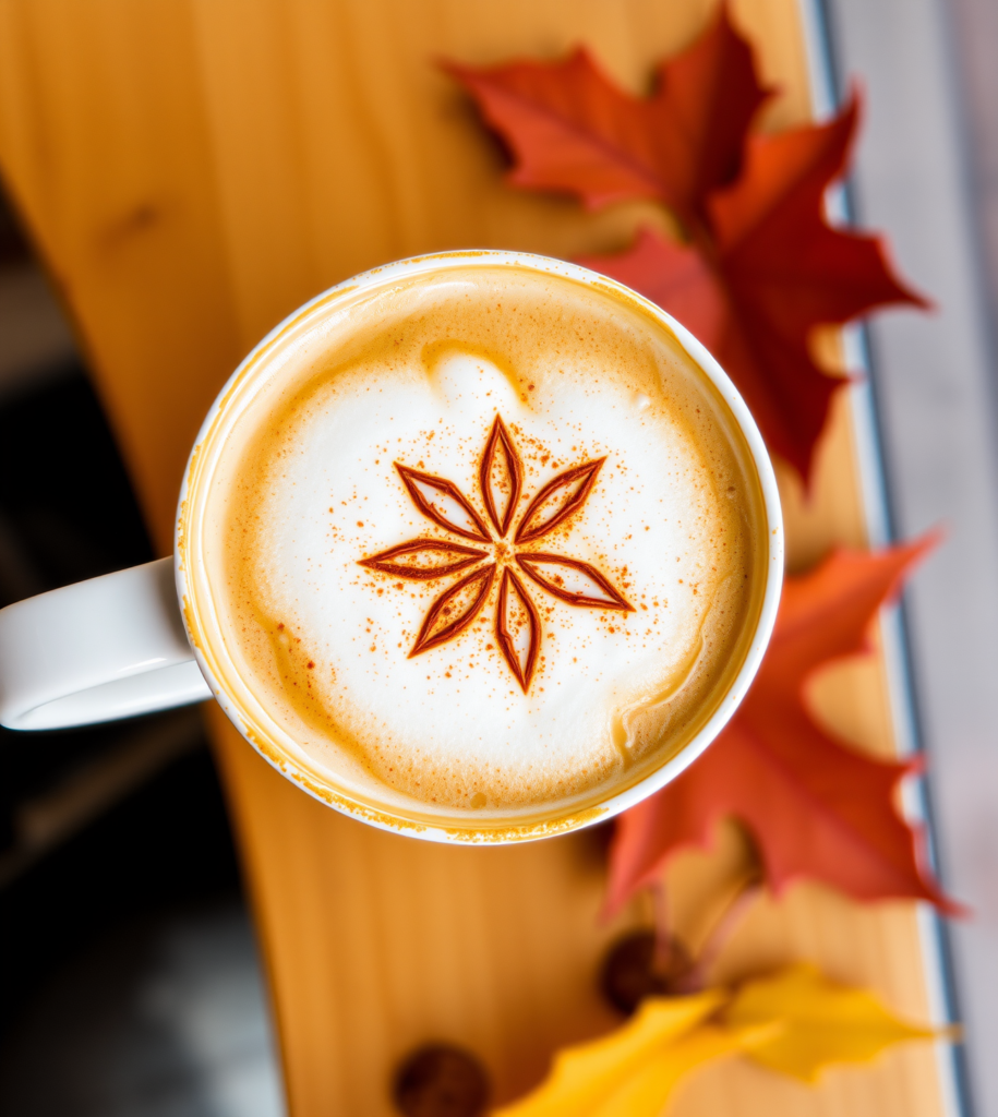 Capturing the cozy essence of autumn, this latte features a star anise design, likely made with sprinkled spices like cinnamon. Surrounded by vibrant fall leaves, it’s a beautifully themed drink that warms the soul.